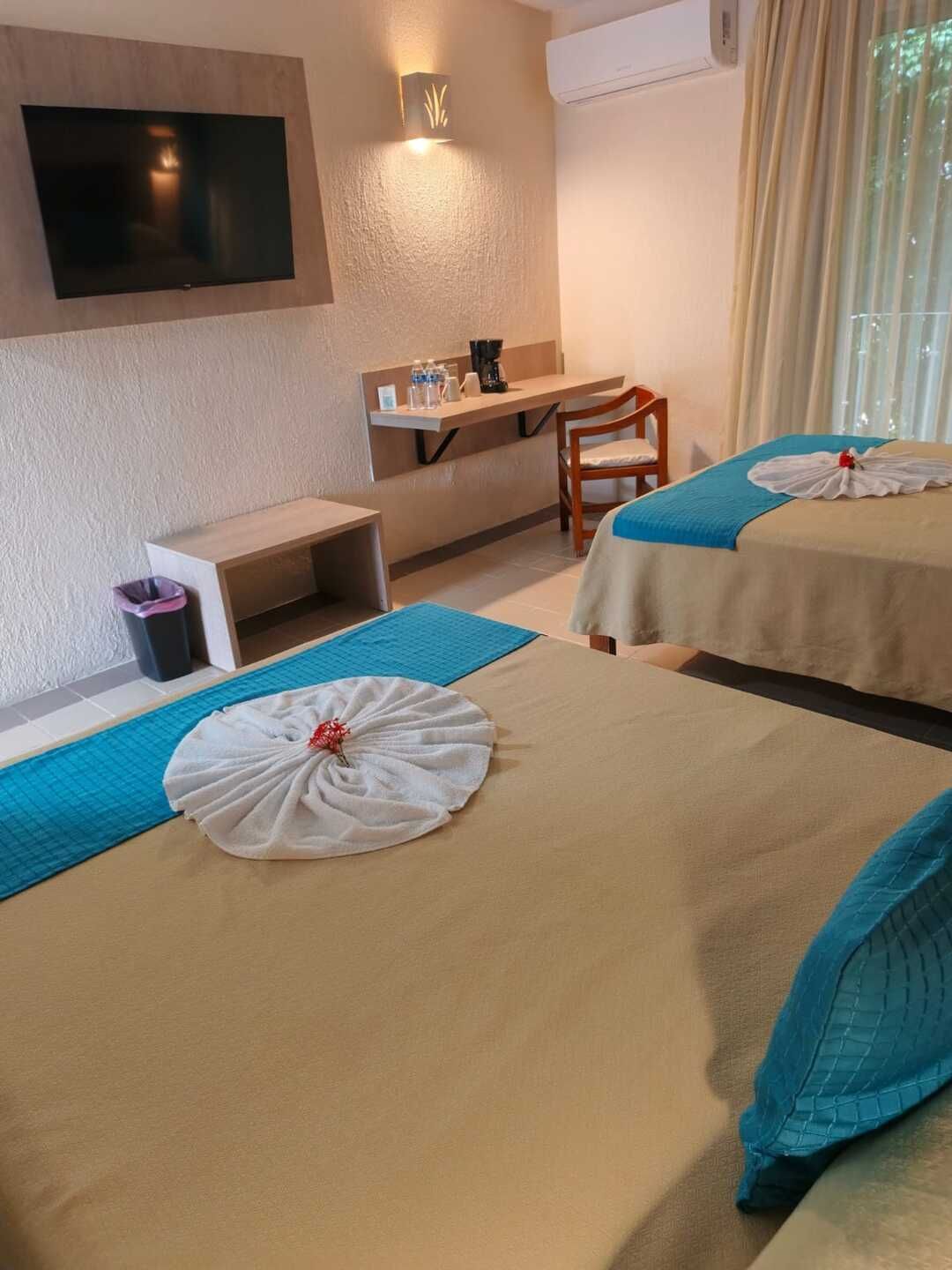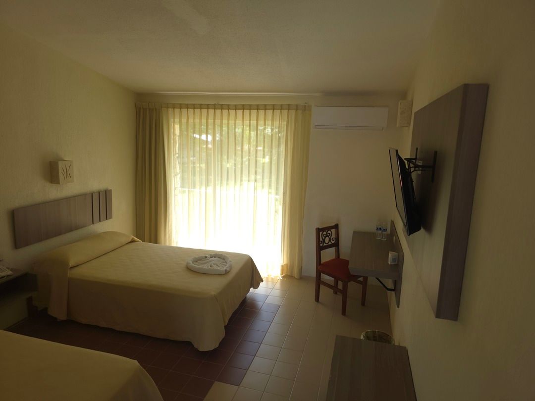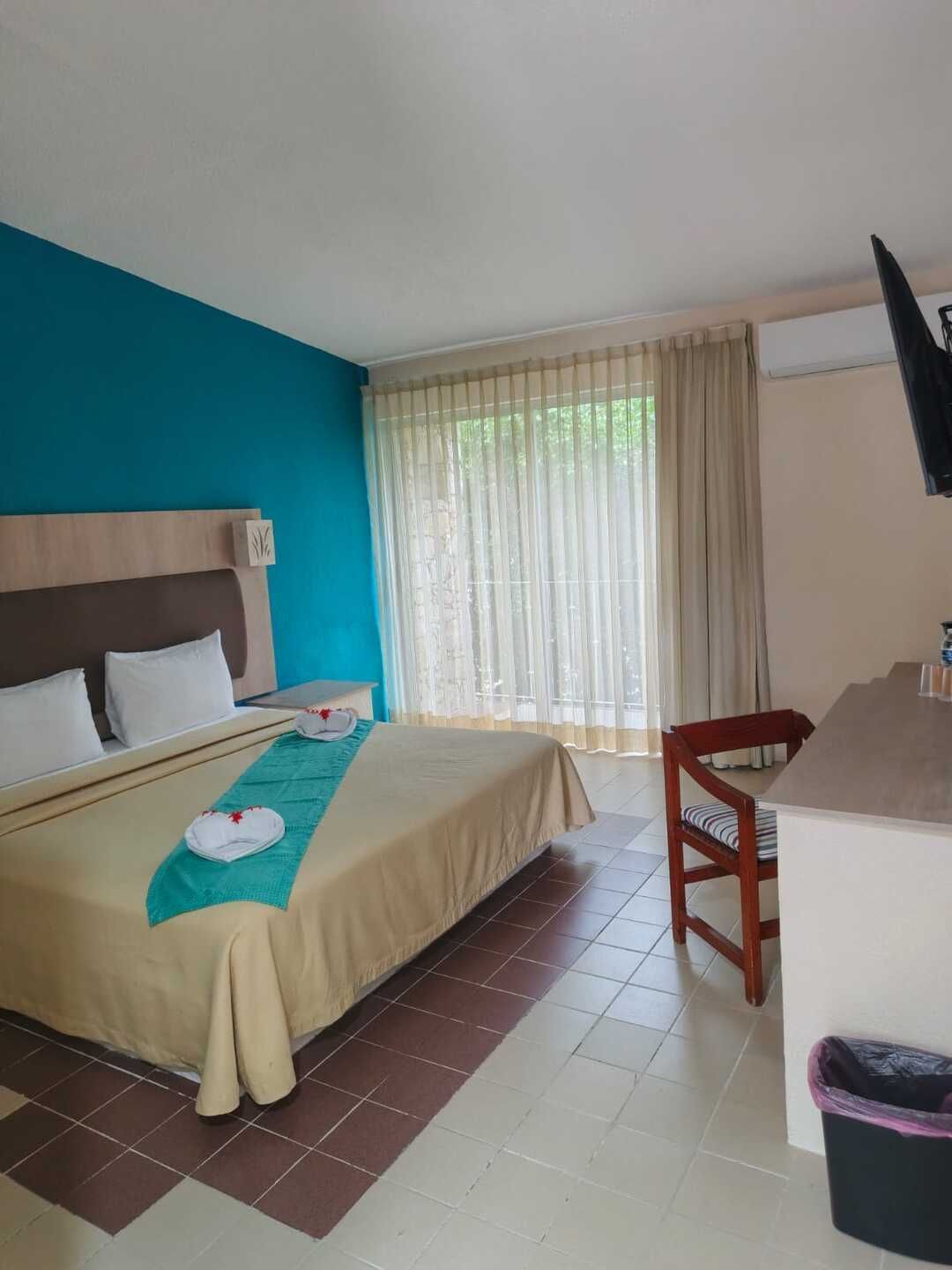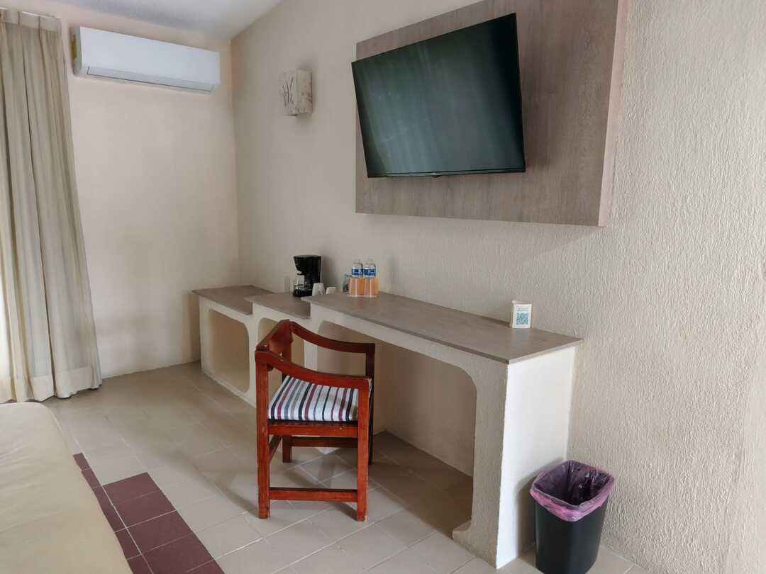 Disfruta el descanso en una amplia cama King Size para dos personas, en un ambiente diseñado para relajarte por completo. Cuenta con aire acondicionado independiente, wifi inalámbrico, TV por cable y teléfono para tu total comodidad. El baño completo con tina te invita a desconectarte y consentirte, mientras que la terraza privada se convierte en tu espacio ideal para disfrutar un momento de tranquilidad. Incluye amenidades de cortesía, secadora de cabello y kit de café para que cada detalle haga tu estancia aún más placentera. Perfecta para una escapada especial o un viaje de descanso.